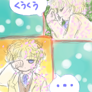 「うわ! 志水くんってば可愛い!」 と桜に埋もれながらスヤスヤしている志水くんを眺める火原っち。 ずっと眺めていてさっきカツサンドをおなかいっぱい食べたせいか自分までうっつらうっつらしかけ。 火原っちの頭や服にも桜の花びらが乗り始める。 そして今度は柚木先輩が登場! 「火原、いったいこんな所で何をしているの?」 といいながら火原っちの頭の乗っかってる花びらを落とす。