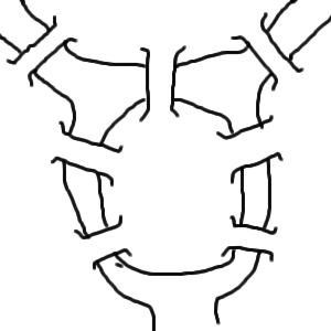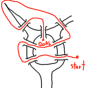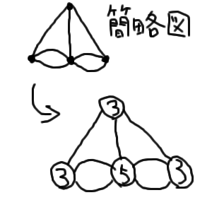 あおちゃそ 正解 これはちょっと有名な問題で答えは「渡れない」なんです 左の図のように陸を点とし、橋を線にして考えると「この図を一筆でかけるか?」と、同じ意味の問題になる ところが分岐点から出る枝道の数をそれぞれ数えると四つの点すべてから奇数個の分岐がのびている 図形を一筆書きするには 「奇数個の分岐点があるものは3つ以上あってはならない」という条件があるんです と、いうわけでこの問題は「渡れない」が正規の答えです では次の問題は「ケーニヒスベルグの橋を同じ橋を一回しか渡らずに全ての橋を渡ってください」←下とまったく同じ問題 ちなみにちゃんと全部渡れます