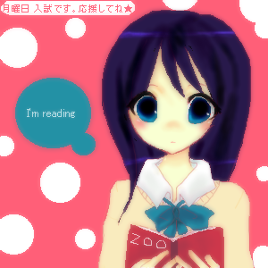 カンタ君が好きそうなおにゃのこ ちなみに手にもってるのは乙一さんのZOOと言う本です〜 ほんとはもっと分厚いんだけどね。。 ねぇねぇ 月曜日には・・・・・・・・なな何と・・・・ 何があると思う? 正解は・・・入試でしたー><(だれかつっこんでね 面接と、作文があるんでがんばりんもす!!!