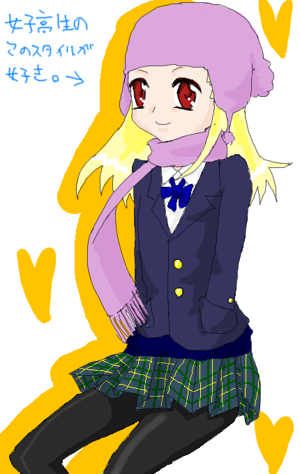 冬になると ・もこもこ帽子 ・ふわふわマフラー ・スパッツ な子が増えて来て非常にムフフな啼です^p^ 寒いのにも関わらずデニールの薄いスパッツ(スパッツって言うの古いのわかってるけど萌えるから使うおw)履いてる子が良いです。 スカートは関東風(短め)でも関西・東北風(長め)でもかまわないのですがちょっとむちっとした太ももが描きたかったので短く。 そんな啼の欲望のせいでプロトが大いなる被害者となりましたwww ごめんよプロト、でも萌えるから許しt(ry ちなみに制服は啼の通ってた高校風。 あくまでも風だからね! 啼は前をちゃんとしめたブレザーの下からセーターが見えてるの大好きだなぁ・・・。 あれ、これってマイナー?(たぶんね)