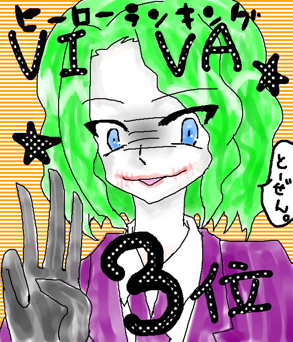 某テレビ番組にて実施されたヒーローランキング。 ジョーカー様が堂々の3位でした!!! ダークサイドのヒーローでランクインしたことよりバットマソより上位だったのがすごいと思った、特に。 魅惑の病院爆破の一部シーンが流れて非常においしかったです。 資料なしで描いてすみません本当に・・・あと眠すぎた・・・。