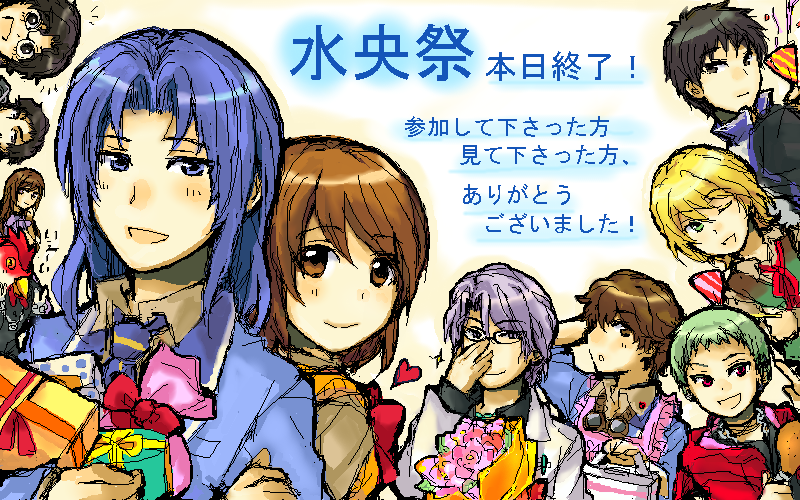 イラストで参加して下さった方、文章で参加して下さった方、 自宅で宣伝してくださったのうこさん。皆さまどうもありがとうございました! ちまちま描いていたら、3時間以上前に出来てしまった集合絵です。 こんなことならもう1枚描けば良かった…! 参加して下さった方の嫁が正確には分からないので全員描いておけばOKかな、とw しかしよく考えたら他作品に嫁がいらっしゃる方がちらほらと浮かんだ…。 (ちなみに先生の花束は笑うところです^^ あと綿貫さん、こんなのが初描きでした…。) で、とりあえずここの今後。 水央、というかくらきみ以外もありな個人的落書き場にします。 つっこみ・投稿は自由な感じで。したい方いらっしゃったら、ですけど。