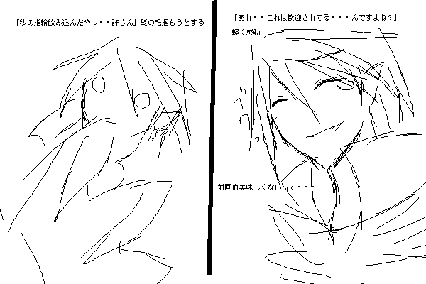 G「お待ちください!前回、貴女の使用人の方がむやみに血与えるなってry」 止める^p^ A「ええぇええい!!気持ち悪いな!」 鎌で一掃する^−^