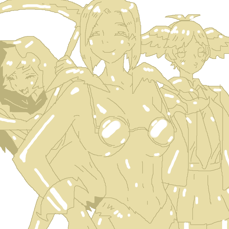 タイムラグがありましたすみません。 全身金色のゴールド化した魔界村シリーズに登場するショートカットの女性に擬人化した死神さんとヒューマンバグ大学に登場する挑発のブロンドヘアーのセクシーな美女に擬人化した望月さんとドラクエシリーズに登場するツインテールの女性に擬人化した3人をリクエストできますでしょうか? 全身金色のゴールド化した3人の虹彩は無しver.の上半身から太ももまでのアップで絵のサイズは800と800でリクエストはカチコチお絵かき2でこちらもライブラリ登録お願いいたします♪ ブロンドヘアーの美女に擬人化した望月さんについてですが望月さんの顔をデスピサロやグレンラガンの様に顔のパーツを彼女のボディのパーツ部分は望月さんの丸っこい眼鏡はおっぱいに当てるブラジャーに見立てて望月さんの髭は彼女のスカートのパーツにできますでしょうか?望月さんの鼻は彼女のお腹に設置で望月さんの後頭部の後ろに残っている海苔みたいな形の髪の毛は彼女が持っている武器にお願いいたします♪望月さんについてはURL貼っておきますのでお願いいたします♪