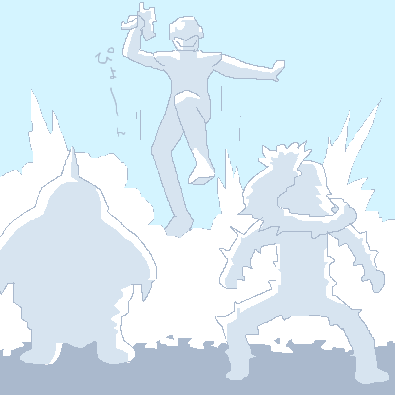 ベムスター、ムカデヨウキヒ、ギャバンルミナス、かきました! 特撮っぽいシーンで、ギャバンルミナス さんがトランポリンで、ぴょーんと 登場した様子です♪