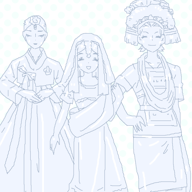 韓国人女性とインド人女性と台湾人女性、かきました! 台湾は中華系の方が90%以上ですが、 台湾固有の衣装を選び、阿美族の 衣装をかきました♪
