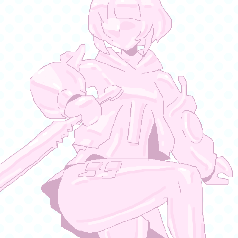 アンビーさん、かきました! 右手右足が同時に出てる立ち絵を 参考にしましたが、右足を出した 構えから、右手の武器を振りぬいた ポーズと読みました♪