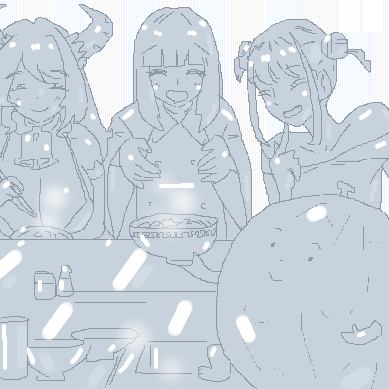 エウフェミアさん、目がイってる女性、魔実さん、かきました! ポンチさんのラーメン屋さんで カウンターに並んでるシーンです♪